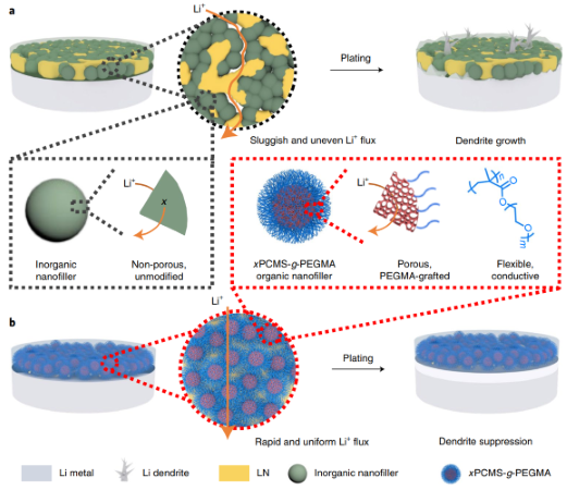 锂金属—电解液界面通常组分不均一且稳定性差,容易引发不可控的锂枝晶生长,并迅速降低电池的循环稳定性,从而严重阻碍锂金属电池的实际应用。有鉴于此,禁漫 吴丁财教授和刘绍鸿副教授等人最近通过多孔高分子刷(超交联聚4-氯甲基苯乙烯纳米球表面接枝聚(低聚乙二醇)甲基丙烯酸甲酯,简称为xPCMS-g-PEGMA)与单离子导电锂化Nafion树脂的合理集成,发展了一种坚固的全有机人工界面保护层,由此获得了高效的无枝晶锂金属负极。具有刚性超交联骨架的多孔xPCMS内核不仅显著提高了人工保护层的机械强度,还可提供快速的锂离子传输通道;与此同时,柔性的PEGMA 侧链以及锂化Nafion树脂有利于形成结构稳定、锂离子扩散均匀且锂离子迁移数高的人工保护层。在该人工固体电解质界面层的保护下,锂金属负极可在10 mA cm-2的超高电流密度下实现超过9100小时(>1年)的超长稳定循环,并在10 mAh cm-2的大面容量下实现超过2800小时的稳定可逆锂沉积/剥离。进一步地,当与高载量正极(~4 mAh cm-2)配对时,受保护的锂负极也显示了出色的电池稳定性,说明实际应用前景广阔。
