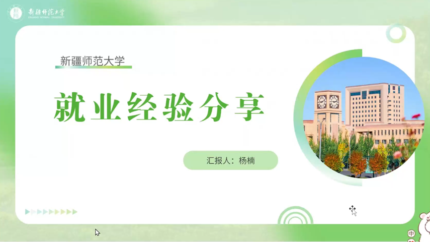 现就职于新疆师范大学的杨楠讲师为我们分享了扎根西部的工作体会。她希望大家在求职时能明确了解自己内心的需求,从而在哪个方向上多多收集信息,侧重发力。对于如何入职高等院校,工作中的获得感,杨楠校友给我们带来了她独到的体会、分享。最后杨楠校友表示,希望通过她的经验分享能为同学们带来启发。