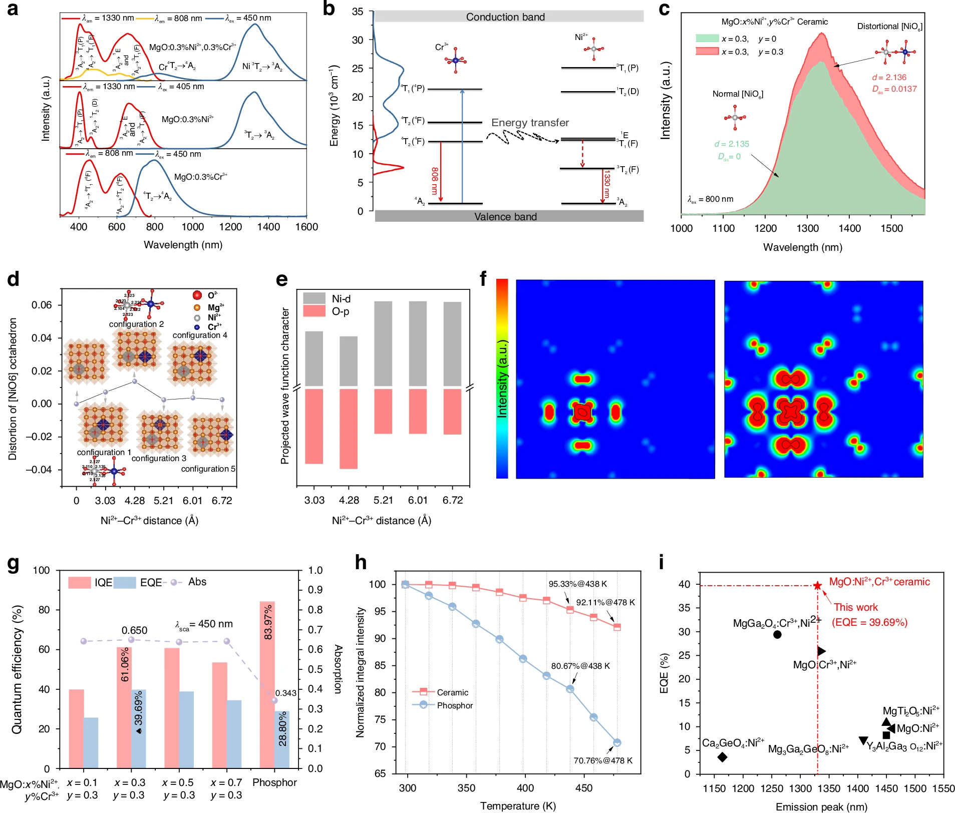 并与重庆邮电大学马重庚教授合作,通过理论计算揭示了Cr3+的共掺杂在Ni2+占据的八面体位点引起结构畸变,这有效打破了d-d跃迁的宇称禁阻,同时实现了从Cr3+到Ni2+的高效能量转移。协同作用下获得了分别为61.06%和39.69%的内/外量子效率。开发制备的MgO:Ni2+,Cr3+陶瓷具有31.28 W·m-1·K-1的高热导率,表现出卓越的热稳定性,在高达478 K的温度下保持了室温发射强度的92.11%。