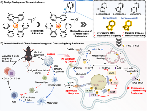 近日,禁漫 巢晖教授团队设计开发了一类线粒体靶向的铱(III)基免疫原性胀亡诱导剂。该类诱导剂不仅能有效突破肿瘤多药耐药瓶颈,还可通过激活机体免疫系统,实现化疗与免疫治疗的协同增效,为癌症治疗提供了新策略(图 1)。研究表明,这类铱(III)基配合物具备多重优势:其一,可通过原位可视化实现细胞内定位追踪,同时显著克服顺铂、阿霉素等临床常用化疗药物的耐药性局限;其二,能高效诱导免疫原性细胞死亡(ICD),并协同激活 cGAS-STING 通路,成功构建 化疗杀伤免疫激活” 的协同治疗模式。从作用机制来看,配合物能快速靶向肿瘤细胞线粒体,破坏其结构完整性,同时升高细胞内氧化应激水平、促进钙离子(Ca2+)释放。这一系列变化会进一步激活CalpainPorimin蛋白,最终在多药耐药肺癌细胞(A549R)中启动胀亡通路。此外,转录组学分析证实,其还能通过重组肌动蛋白细胞骨架、调节 ABC 转运蛋白活性、重塑糖酵解与糖异生代谢途径。