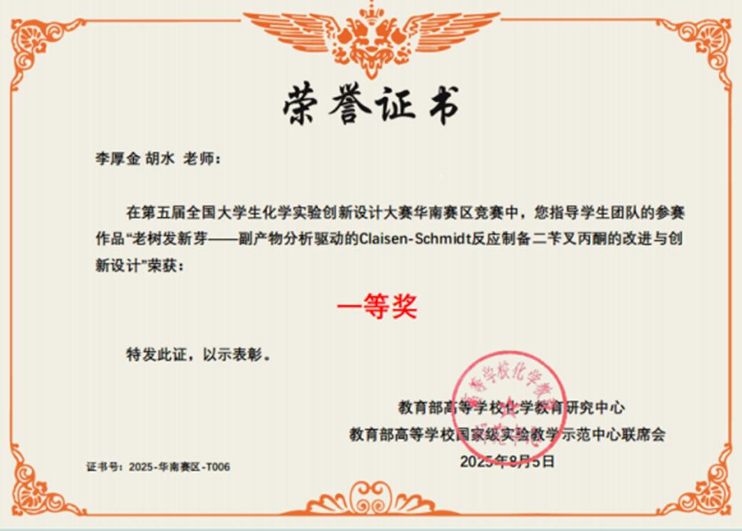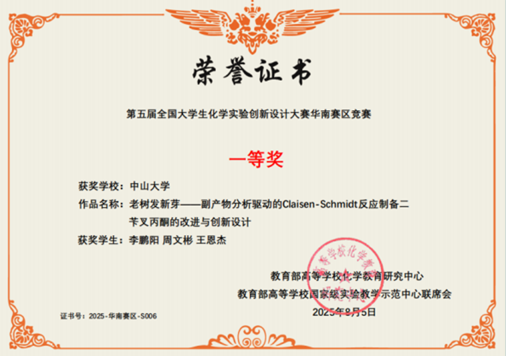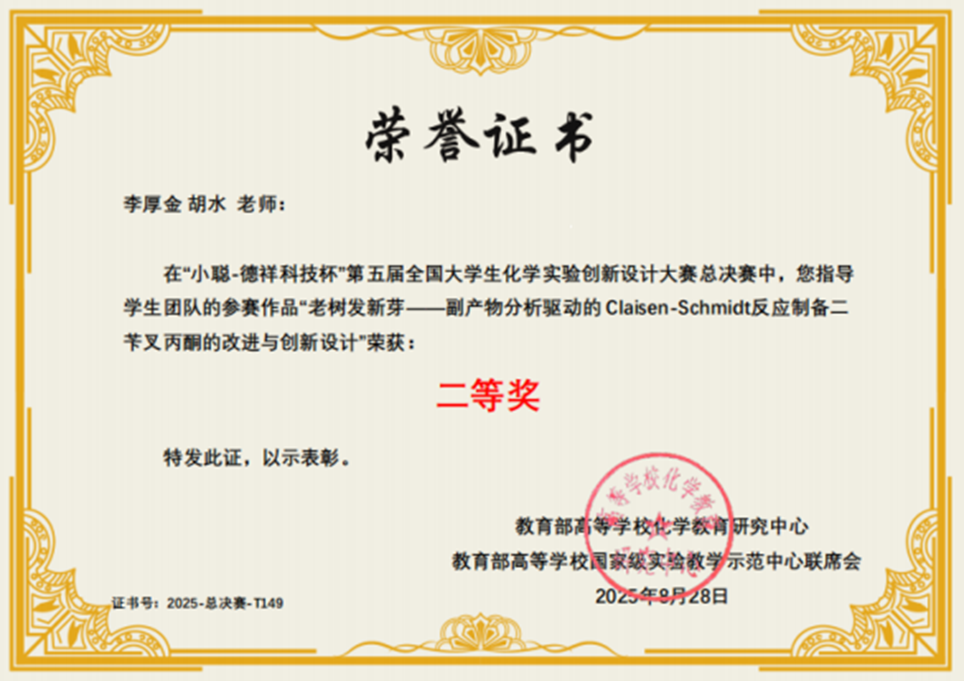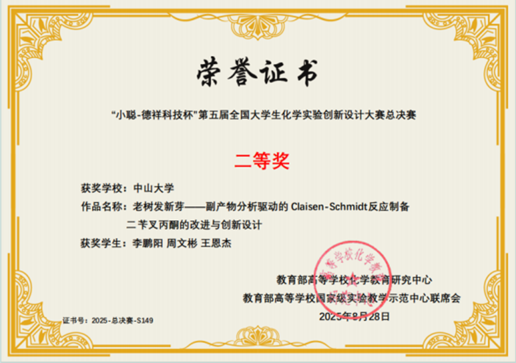 导航痕迹 禁漫 化学国家级实验教学示范中心 化学竞赛 “微瑞杯”第五届 (2024年和2025年) 全国大学生创新实验设计竞赛 禁漫 -改进实验-总决赛二等奖、华南区一等奖 扫描此二维码分享 禁漫 -改进实验-总决赛二等奖、华南区一等奖 发布人:网站管理员 发布日期:2025-10-09 老树发新芽——副产物分析驱动的Claisen-Schmidt(克莱森-施密特)反应制备二苄叉丙酮的改进与创新设计