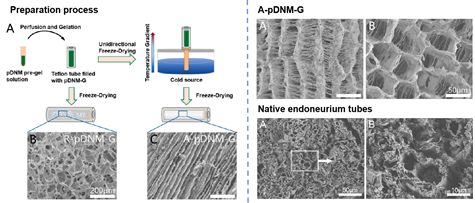 将高活性的生物材料或者生长因子与拓扑信号相结合,能为组织和器官提供物理和化学双仿生的再生微环境。该研究利用脱细胞基质材料与物理导向结构结合的策略,构建了成分与结构高度仿生的人工神经导管,为临床上周围神经损伤修复提供了选择。该工作近期发表在Materials Science&Engineering C上,论文的第一作者为博士生饶子龙,共同通讯作者为禁漫 材料科学与工程学院全大萍教授、白莹副教授与禁漫 附属第一医院朱庆棠教授。