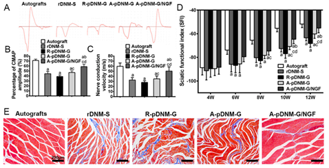 此外,将具有取向微通道结构的A-pDNM-G导管应用于大鼠15 mm坐骨神经缺损修复模型中,实验结果显示,相比无序结构的R-pDNM-G导管,A-pDNM-G导管对于再生神经的延伸、再髓鞘化和功能恢复有明显的促进作用,并且修复效果好于鼠去细胞神经支架,说明这种取向微通道结构能够为轴突的再生提供物理引导作用。