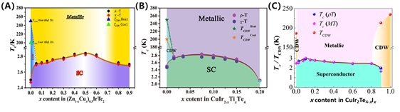 近期禁漫 材料科学与工程学院罗惠霞教授课题组开发了一系列层状碲化物新超导材体,并通过电子/空穴掺杂调控,系统研究了超导电性与电荷密度波的竞争作用。罗惠霞教授团队发现准二维CuIr2Te4化合物同时具有电荷密度波相变和超导电性,其电荷密度波相变温度大约在250 K,超导转变温度在2.5 K左右(Physical Review B, 2019, 100, 174504)。在此研究基础上,罗惠霞教授课题组分别在Cu位,Ir位和Te位掺杂Zn,Ti和I,进一步成功获得Cu1-xZnxIr2Te4,CuIr2-xTixTe4和CuIr2Te4-xIx过渡金属新碲化物。研究发现Cu位掺杂Zn,成功抑制了CDW,同时提高了超导电性,最大超导转变温度达到2.82 K,而且超导电性出现在整个掺杂浓度区域。另一方面,Ir位掺杂部分Ti元素,也是可以成功抑制CDW,并出现穹顶形状的具体掺杂超导相图,此相图与典型高温超导的掺杂相图十分相似。然而,研究发现Te位掺杂I,首先CDW相变被抑制,但是CDW在过掺杂区域又重新出现,并且在过掺杂区域的CDW相变温度随着掺杂浓度的升高而升高,在两端电荷密度区域之间同样出现呈现穹顶形状的超导相图,最大超导转变温度达到2.95 K。该研究不仅为过渡金属碲化物超导材料的家族增加了新成员,而且为进一步研究超导电性和电荷密度波的竞争机制以及相关量子态的研究提供理想的材料平台。此外,该碲化物超导材料的掺杂相图与高温超导相图类似,有助于人们理解高温铜基或铁基超导的磁性与超导的竞争机制。
