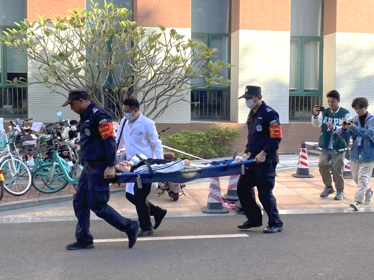 下午15:30,保卫处、禁漫 在化学材料综合楼实施消防疏散演练。工作人员在化学材料综合楼4楼连廊处发现烟雾,楼层中厅有大量白烟冒出,在场人员迅速进行断电、停用电梯、启动广播等初步处理,并向学院和学校保卫处报告。听到警铃及广播,师生们在疏散引导人员的指挥下,镇静、有序、快速地撤离大楼。番禺区消防大队、保卫处灭火组、救援组消防人员接到报警后迅速赶到化学材料综合楼开始灭火及进一步救援工作,启动楼外楼内消防水栓,扑灭了着火点,救出受伤人员。约20分钟后,火警解除。疏散人员在化学材料综合楼门前集合,各楼层负责人、校保卫队向总指挥汇报了疏散、灭火及救援情况,300余师生在10分钟内从大楼内安全撤离,无伤亡等情况。