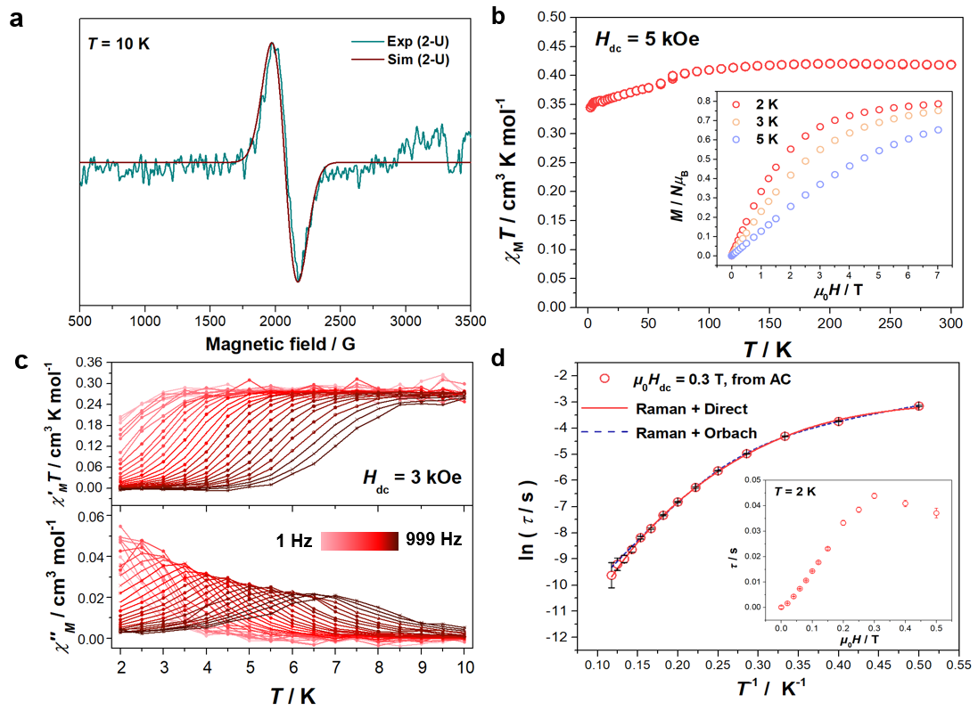 3五价铀酰配合物的低温X-波段EPR波谱 (a), 直流 (b) 及交流 (c) 磁性以及磁弛豫过程分析 (d)