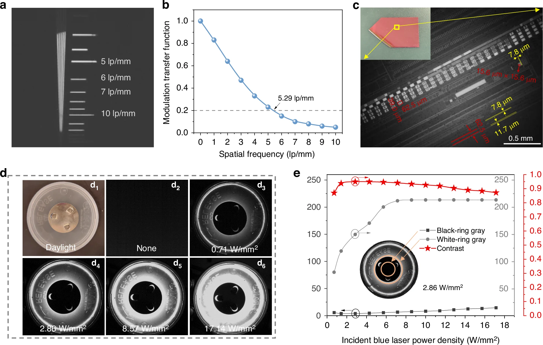 图4. 基于激光驱动的NIR-II光源的应用。a) 采用MgO:0.3%Ni2+,0.3%Cr3+陶瓷制备的激光驱动近红外II光源空间分辨率,通过标准线对卡测定。 b) 基于MgO:0.3%Ni2+,0.3%Cr3+陶瓷的激光驱动近红外II光源调制传递函数曲线。 c) 商业硅片内部集成微结构照片:左上角插图为日光下可见光相机拍摄,其余为近红外相机在所得近红外II光源下拍摄。 d) 塑料盒上铁片的摄影:日光下可见光相机拍摄(d1),暗室中红外相机拍摄(d2),不同蓝光激光功率密度下本NIR-II光源照射效果(d3-d6)。e) 塑料盒白色环(实点线)与铁片黑色环(实方线)的近红外图像灰度变化趋势,以及白色/黑色环近红外图像的对比度变化趋势(实星线),在不同蓝光激光功率密度下暴露于本实验室NIR-II光源时的变化。插图为在2.86 W/mm2激发条件下塑料盒上铁片的NIR图像。