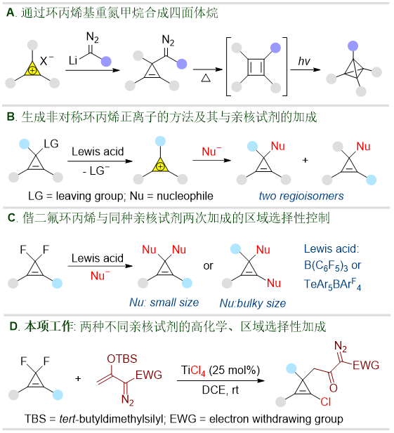 近日,周磊教授团队以TiCl4为路易斯酸催化剂,实现了偕二氟环丙烯的两次碳-氟键官能化,将氯负离子和重氮烯醇硅醚这两种不同的亲核试剂高化学、区域选择性地加成到环丙烯正离子的相邻位置(图1 d)。