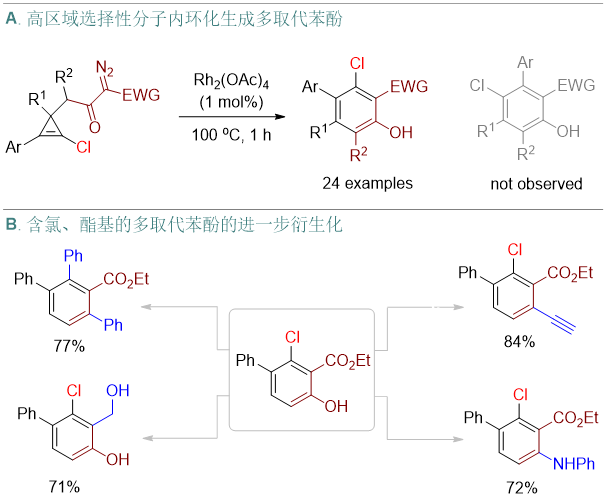 该反应所得的2-氯环丙烯基桥连重氮羰基化合物,在Rh2(OAc)4的催化下可以高效、高区域选择性地分子内环异构化为多取代的苯酚(图4 a)。其中的酚羟基、Csp2-Cl以及酯基都具有丰富的转化,可以通过简单地转化得到一系列多取代苯衍生物(图4 b)。
